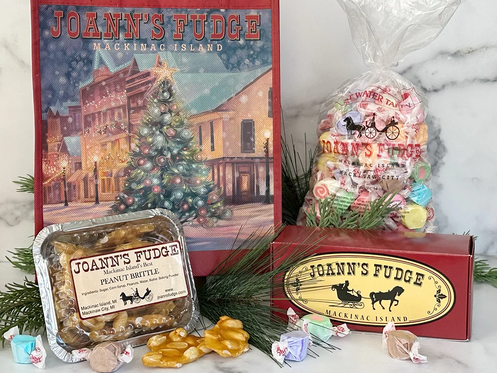 Christmas Special package includes 14 oz. bag of taffy, a 1/2 lb. of Peanut Brittle, three slices of fudge and Joann’s new holiday tote.