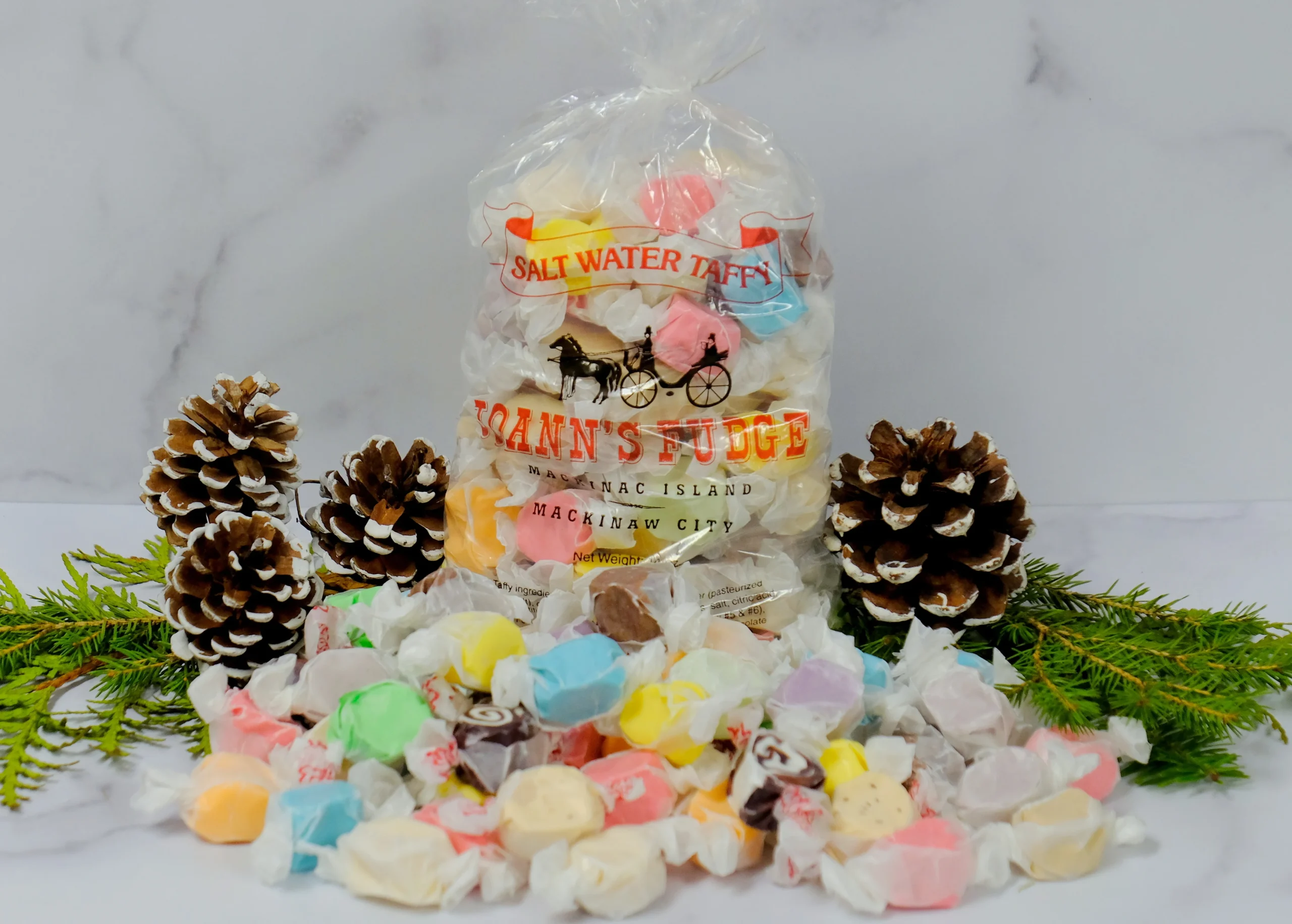 A traditional favorite on Mackinac Island, our rich and chewy salt water taffy features an assortment of popular flavors. 14 oz bag.